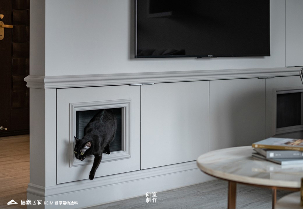 除此之外,也可透過在櫃體打洞或設置獨立貓屋,讓貓咪自由穿梭在各個區域,同時保有隱密性。與不經意從貓洞探出頭的毛小孩對視,是許多飼主表示最療癒的幸福時光。
