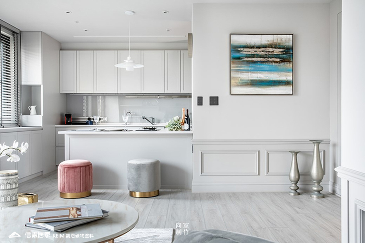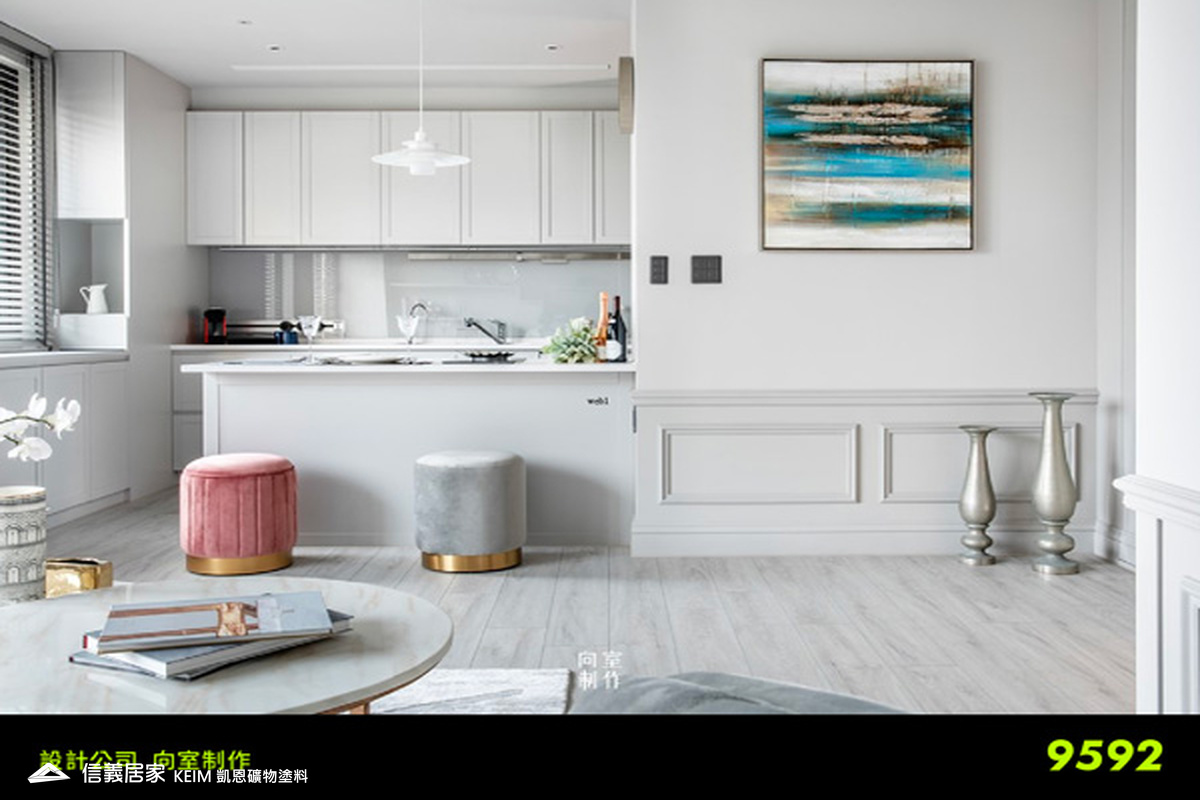 冷灰色木地板既有淺色地板的輕盈,也有深色地板的穩重,使用冷灰色木地板能創造出高雅的氛圍。在牆面選色上,推薦以灰色系(如色號9592)的方向挑選,使室內空間圍繞在冷色調的配色主軸,打造出輕奢時尚的生活空間。