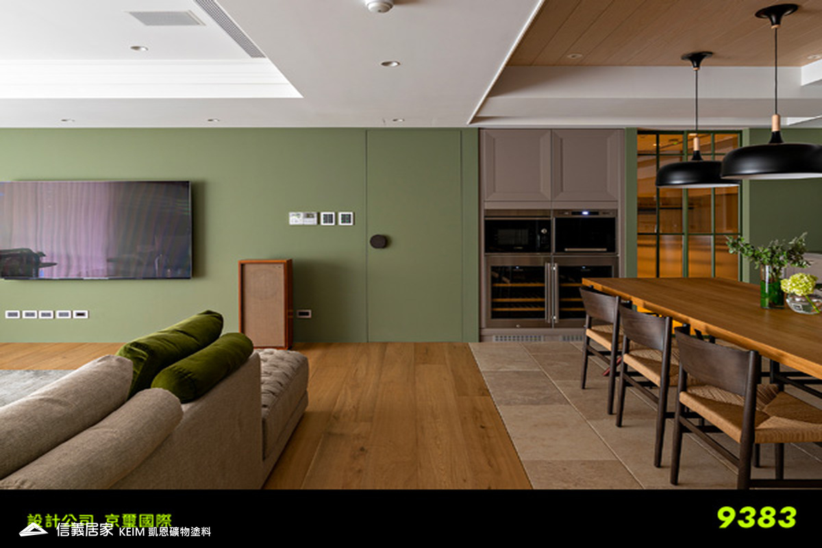 深色木地板能帶出大器、沉穩的感受,牆面配色普遍都以淺色系(如色號9870、9294)的顏色為主。不過,若空間所處位置採光充足,也十分推薦嘗試使用彩度較高的顏色(如色號9383),營造出品味出眾的個性空間。