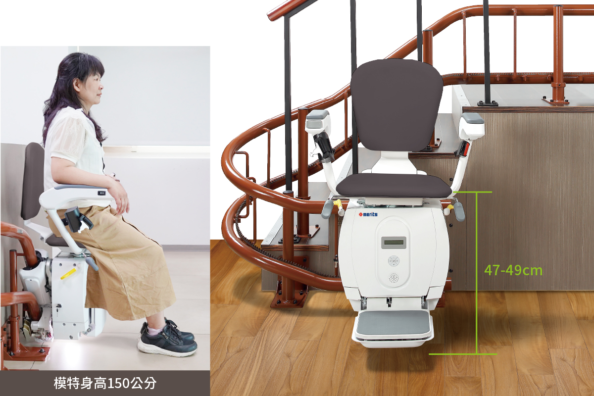 E606是全球首創的超低座高樓梯升降椅,座椅離地僅 47~49 公分,這項突破性設計讓中小體型的使用者能雙腳自然著地、不必墊腳即可輕鬆就座。