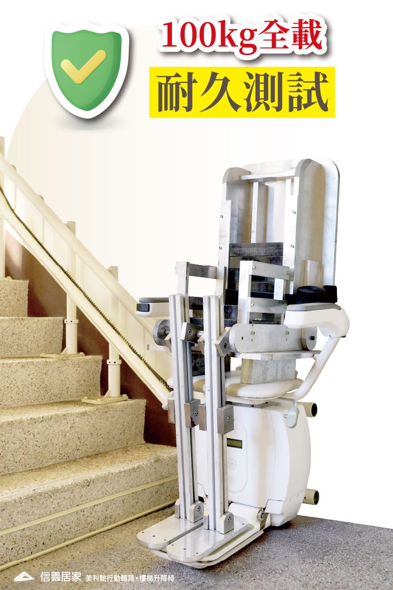 美利馳E606通過CNS15830國家標準檢測,產品符合法規,申請補助沒問題。同時也通過100kg耐久測試,此測試驗證了產品在正常保養下的長期使用安全與穩定性。