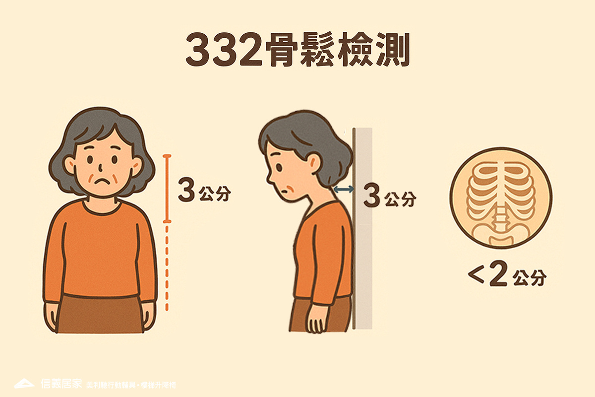 如果不想去醫院,日常生活則可以用「332骨鬆檢測」為家人自我檢測。第一個「3」表示現在的身高比過去矮了3公分以上;第二個「3」則是背靠牆時,後頸與牆之間的距離大於3公分;「2」代表肋骨最下緣與骨盆之間的距離小於2公分。