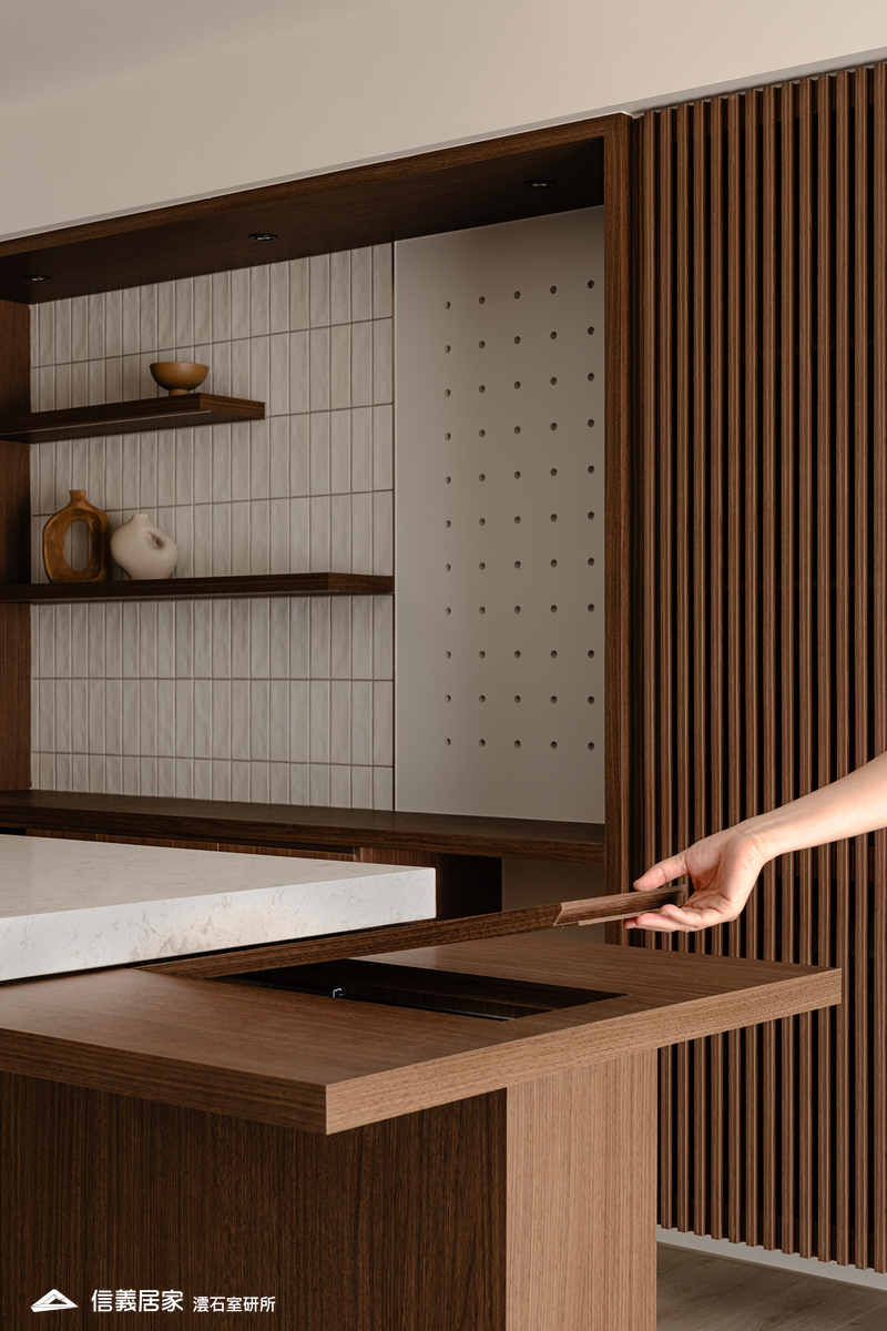 中島桌板具伸縮機能,既是料理台、也是可延展的長桌,能靈活應對日常與聚會使用。