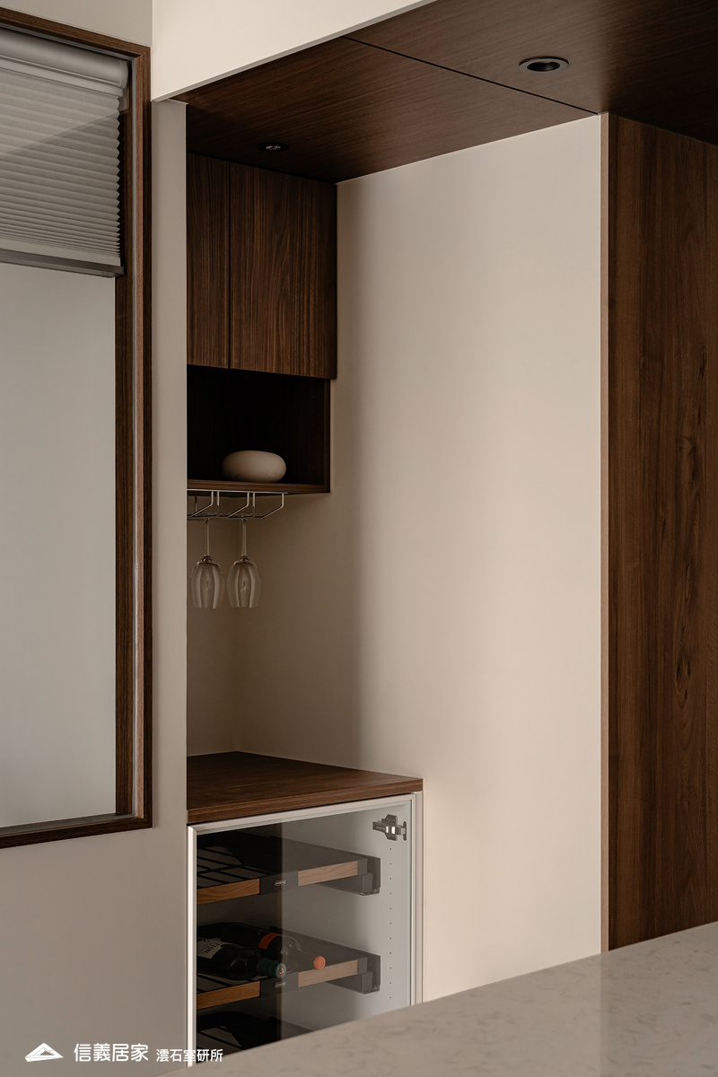 隔間退後後,新設了茶水吧與紅酒櫃,串連客、餐、中島三區域,形成可自然迴行的「回字動線」。