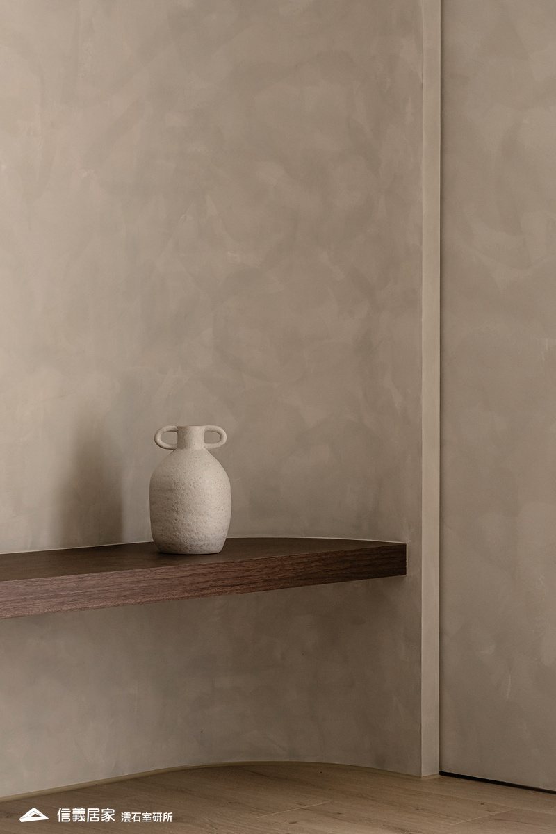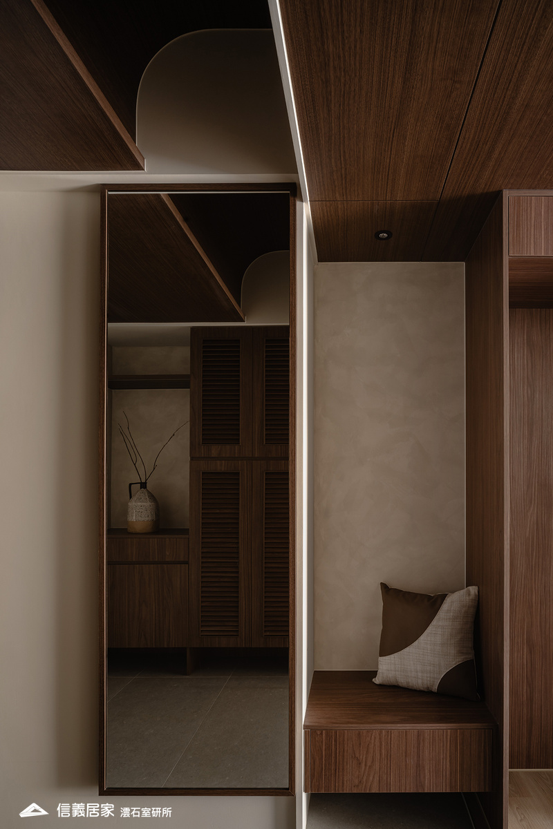 進門處以弧形落塵區與木地板劃界,柔化空間線條,形成迎賓的節奏感。玄關整合多重機能:旋轉鞋架提升收納效率,百葉門片維持通風,滑軌鏡面更巧妙隱藏弱電箱,兼顧美觀與實用。