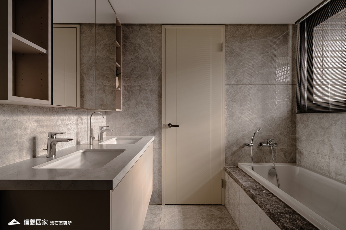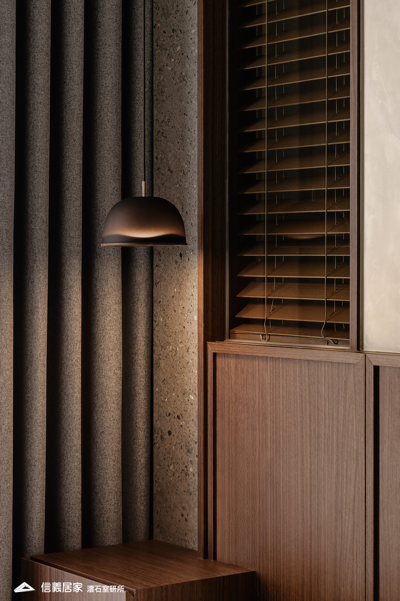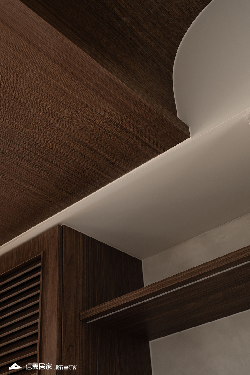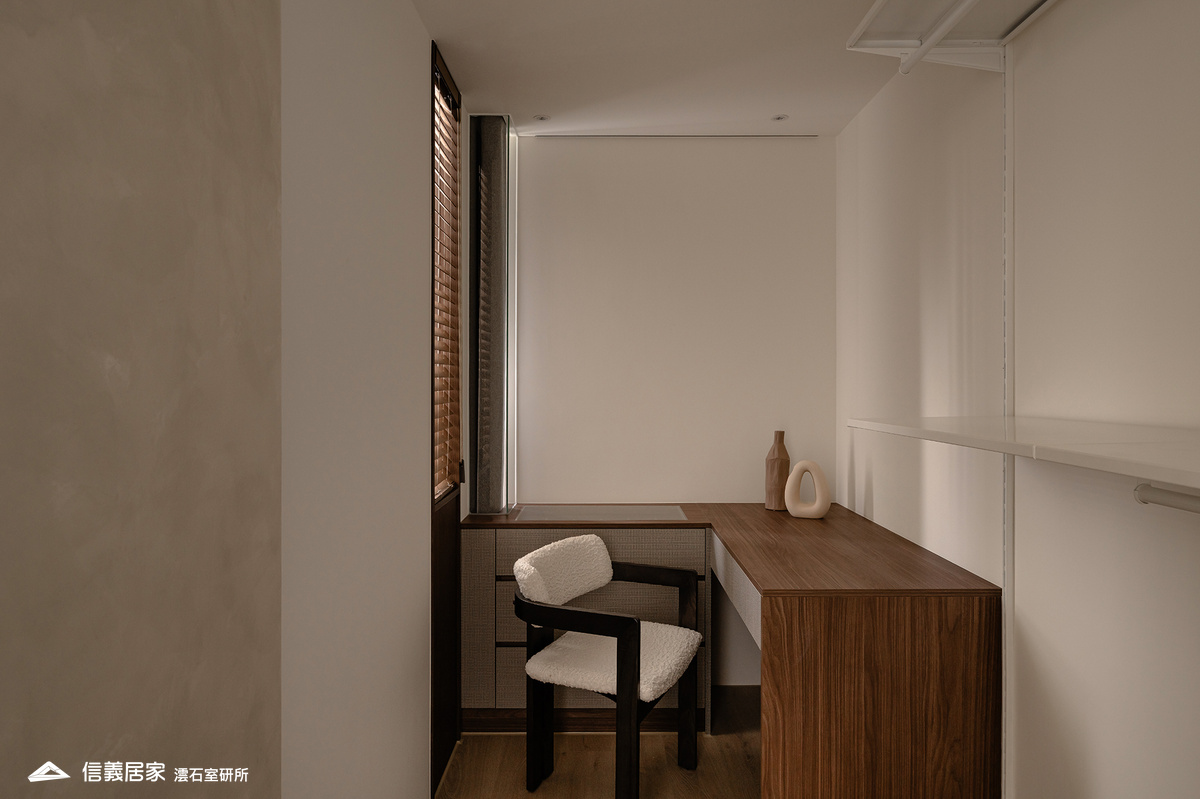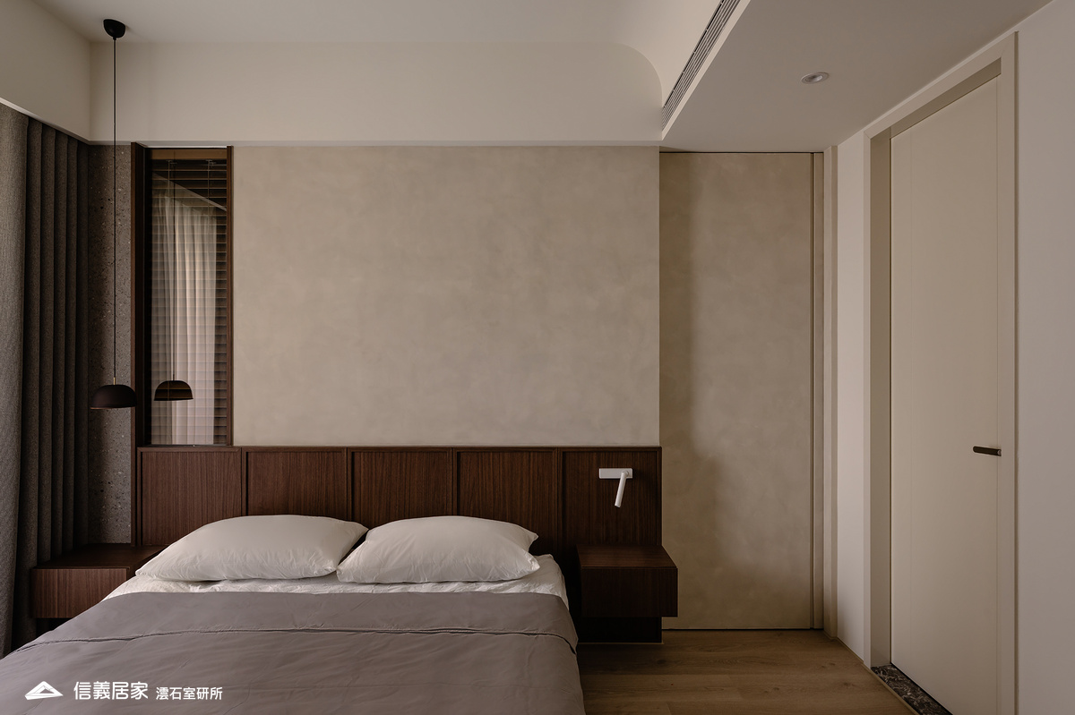 主臥配置雙更衣間設計,床頭位移避樑壓迫,並以木百葉導入自然光,讓私領域更顯靜謐而柔和。