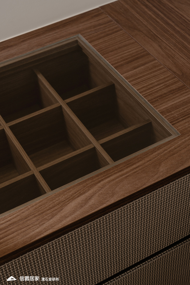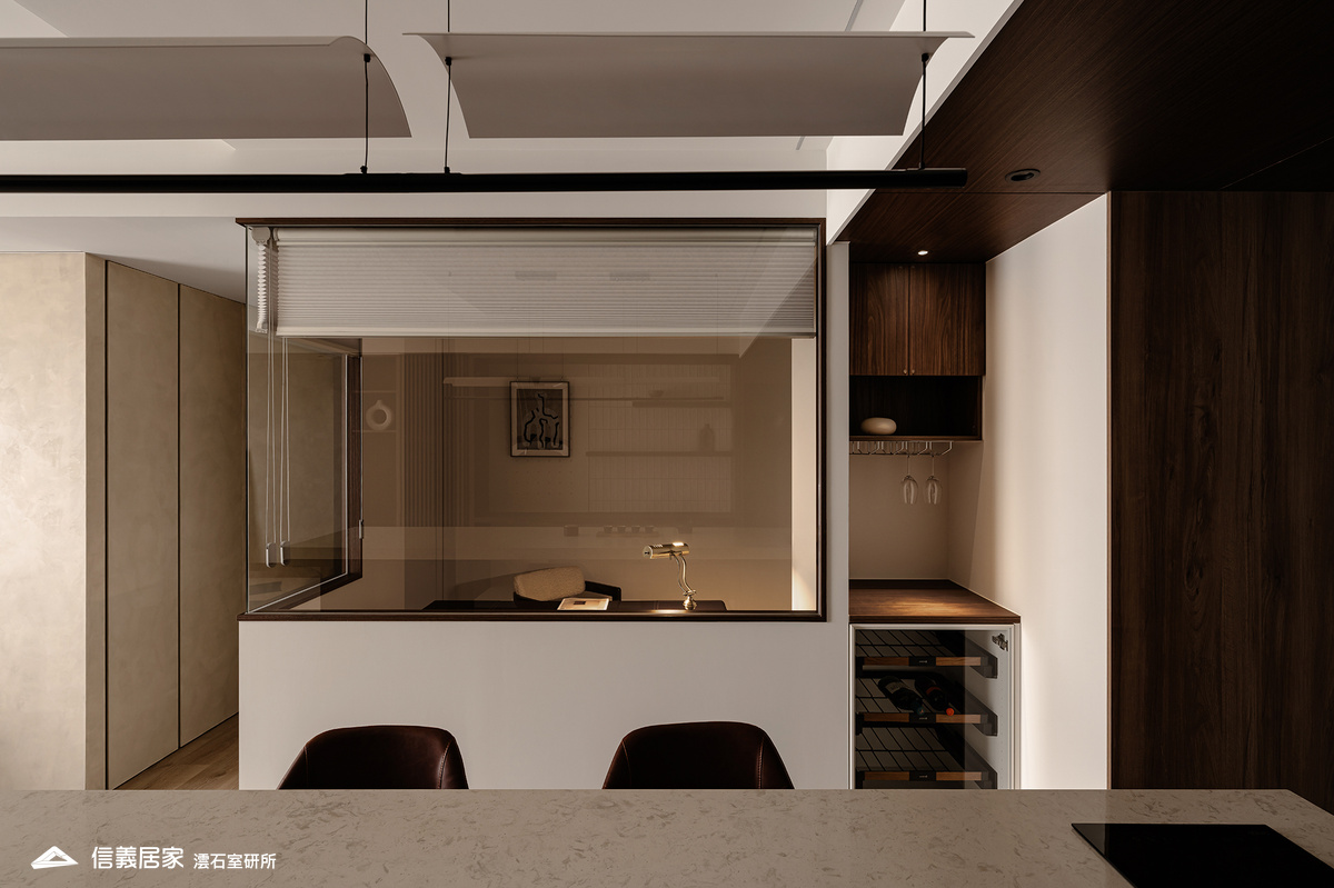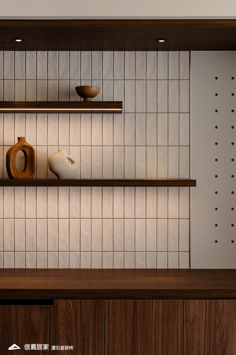 同時延續電視牆造型,設置實心拉門與吊畫軌道,讓生活場景如藝廊般隨光而變。茶水櫃以油條磚與洞洞板拼接,異材質交錯的層次感,兼具展示與收納機能;紅酒櫃則成為公領域的視覺亮點。