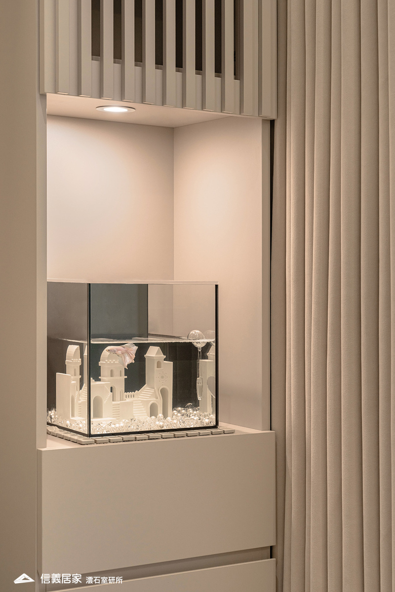 沙發一角是家中粉色半月鬥魚的秘密城堡,看著水中漫游舞姿的模樣,是業主療癒放空的小天地之一。