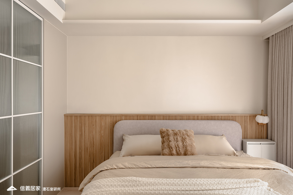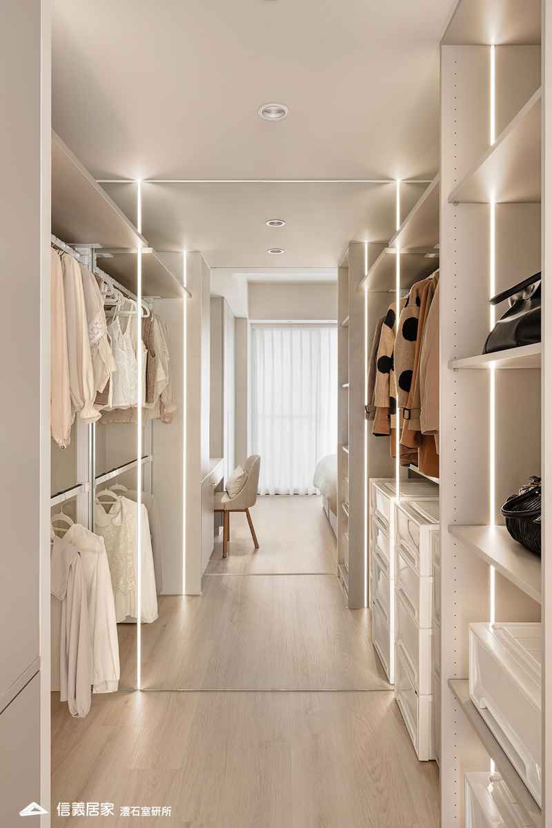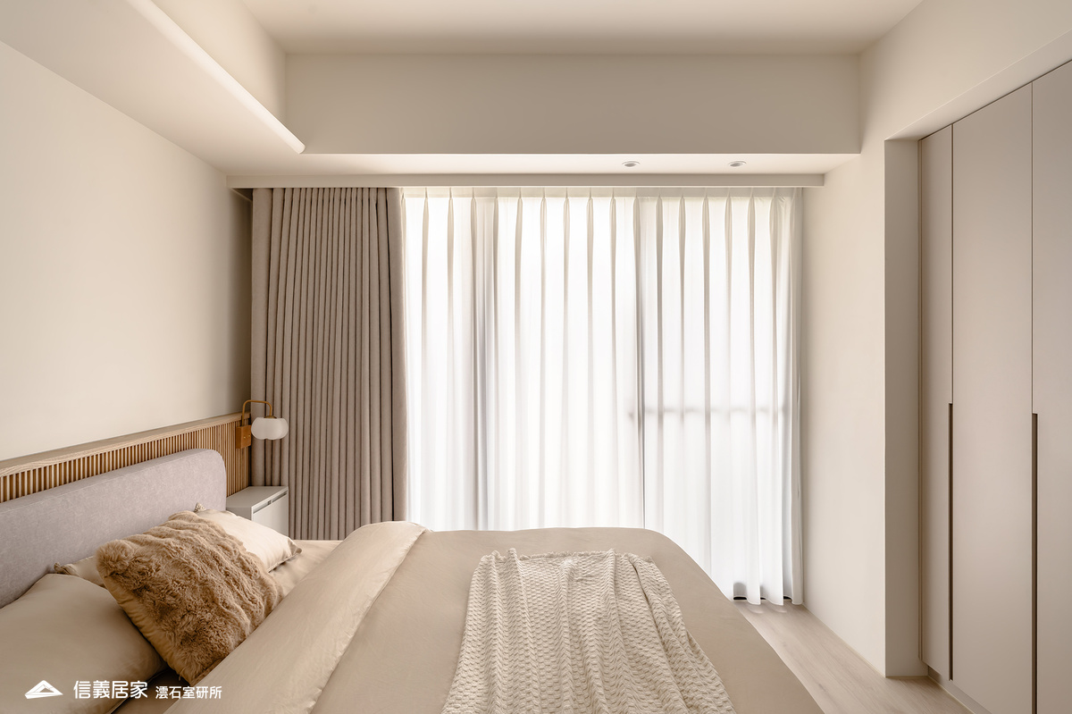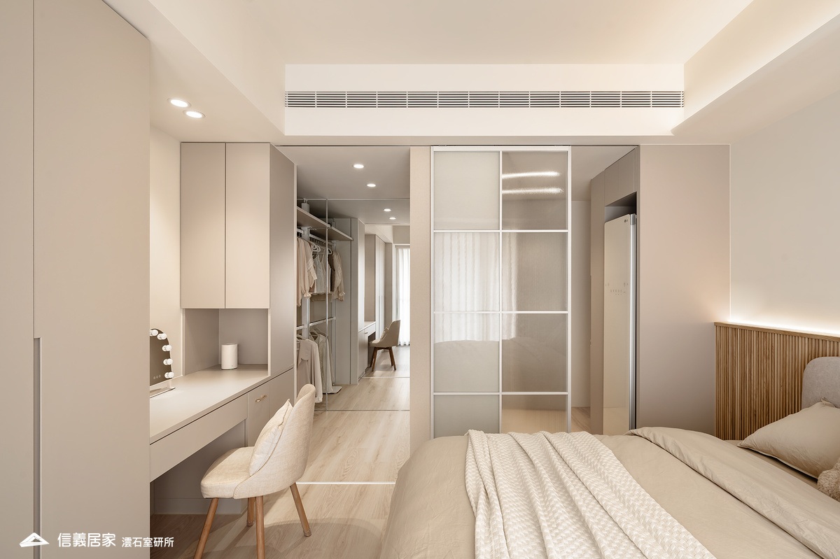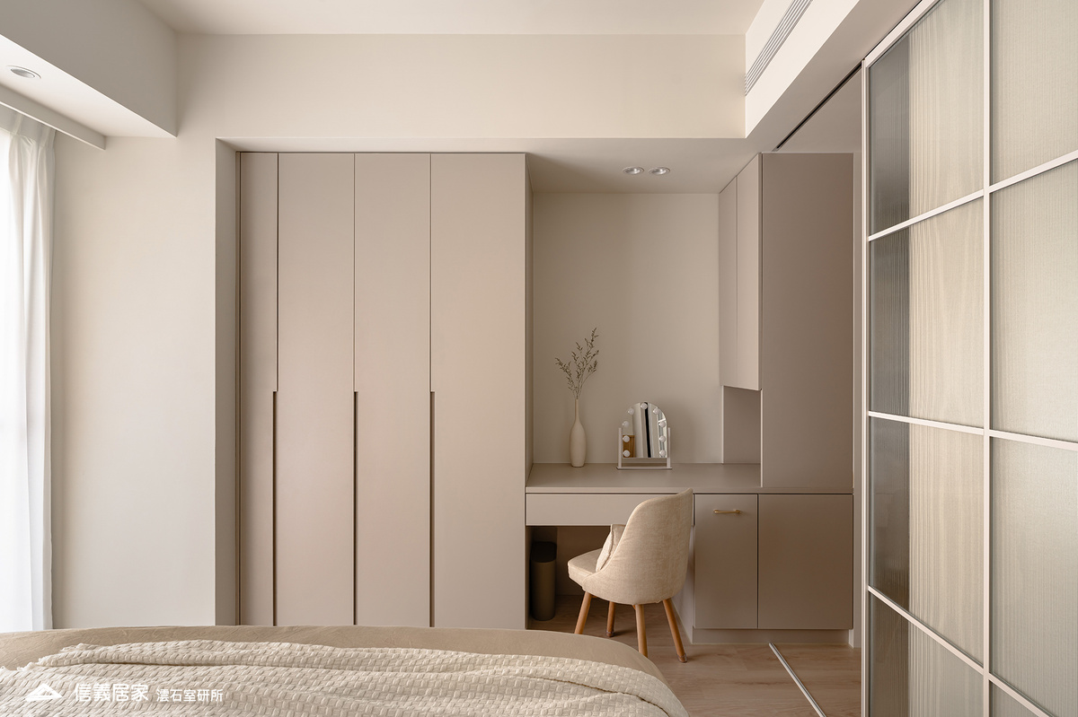 主臥入口設計小玄關,提升私領域隱蔽性;溫柔色調延伸至床尾,衣櫃與梳妝台一體成形,銜接至拉門式衣帽間,營造出井然有序的生活場景,也可依日常搭配動線靈活使用。