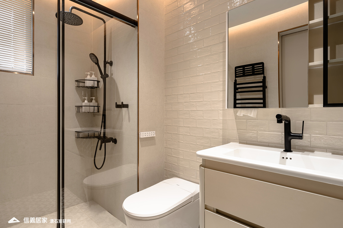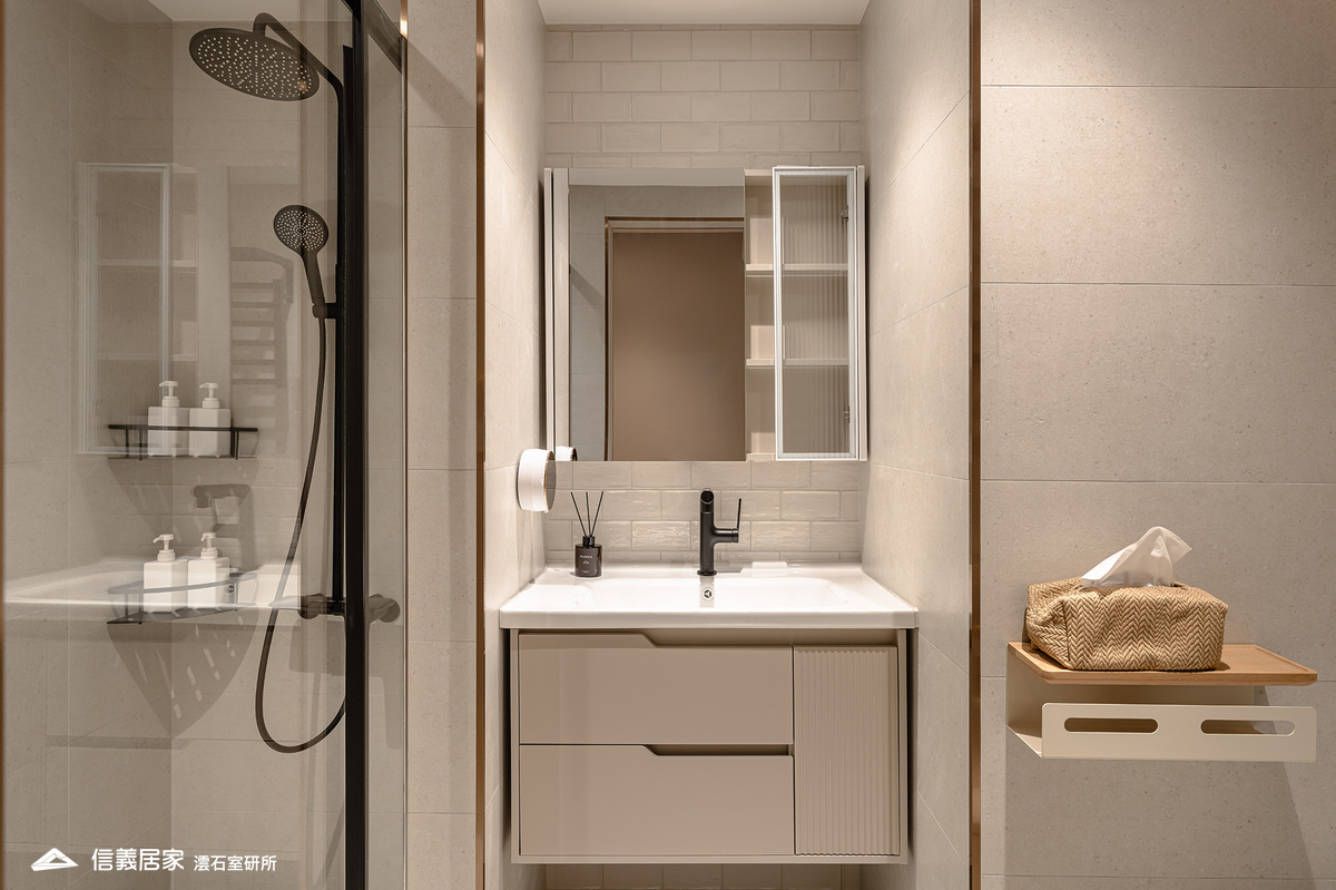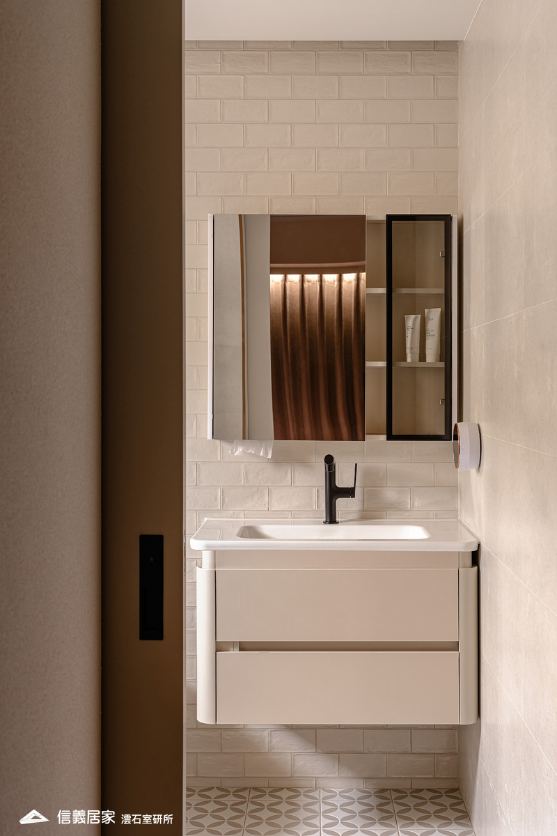 主浴以杏色壁磚作為視覺主牆,並以米灰色壁磚相互襯托,地板花磚將整體視覺帶入優雅可愛風貌。