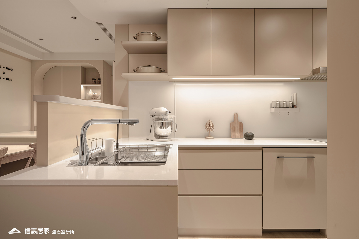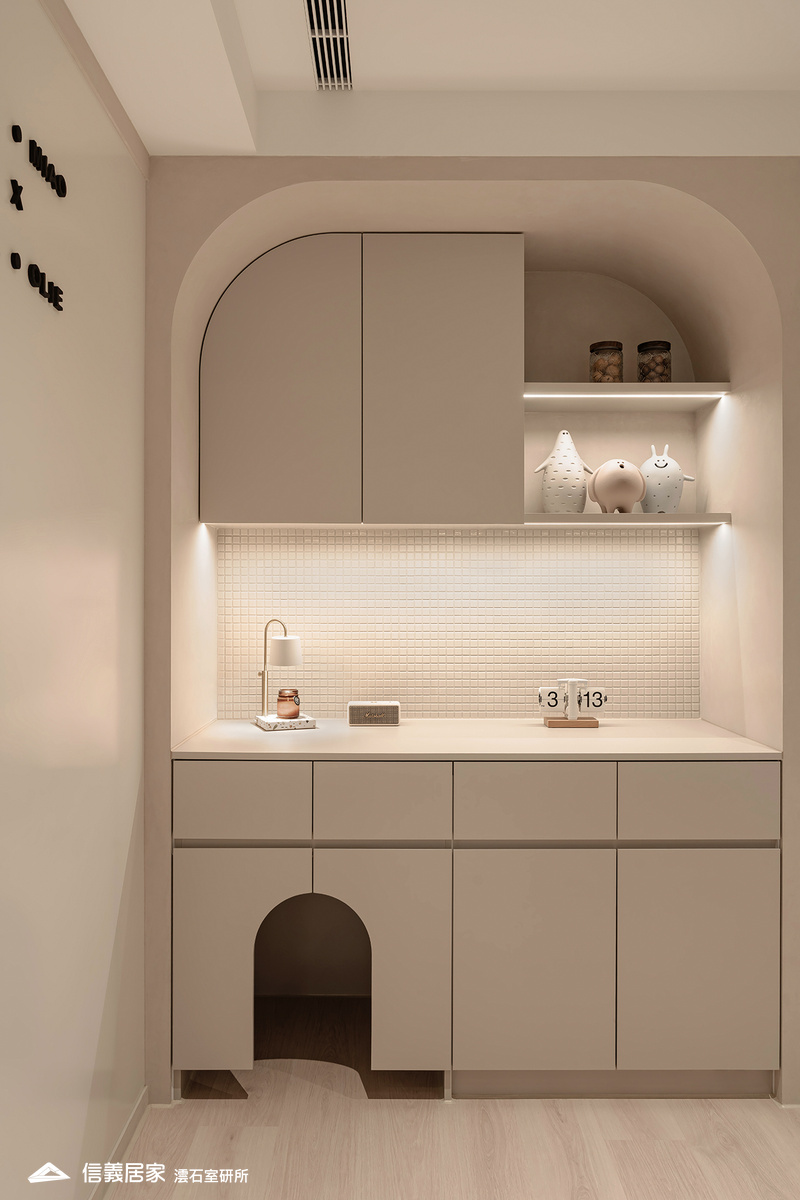 圓潤的餐邊櫃造型是餐區的亮點之一,背板選用暖白色馬賽克磚,為視覺層次更添豐富,同時具好清潔特點,櫃體下方圓拱小門是貓砂盆的專屬小屋,並與主臥下方的貓門相連,讓貓咪的生活動線順暢無礙。衛浴空間以米白色壁磚與鍍鈦金屬細節交織,在韓系奶油色中滲入一絲輕奢。