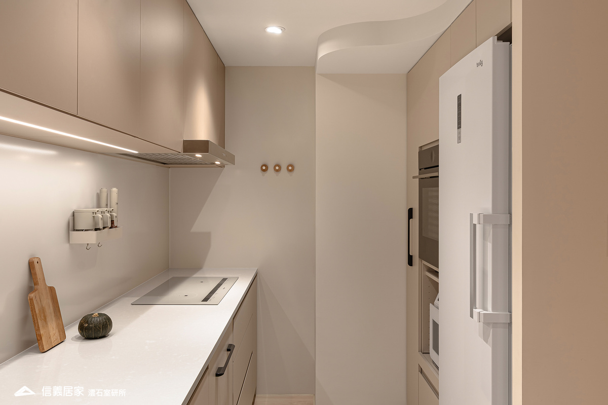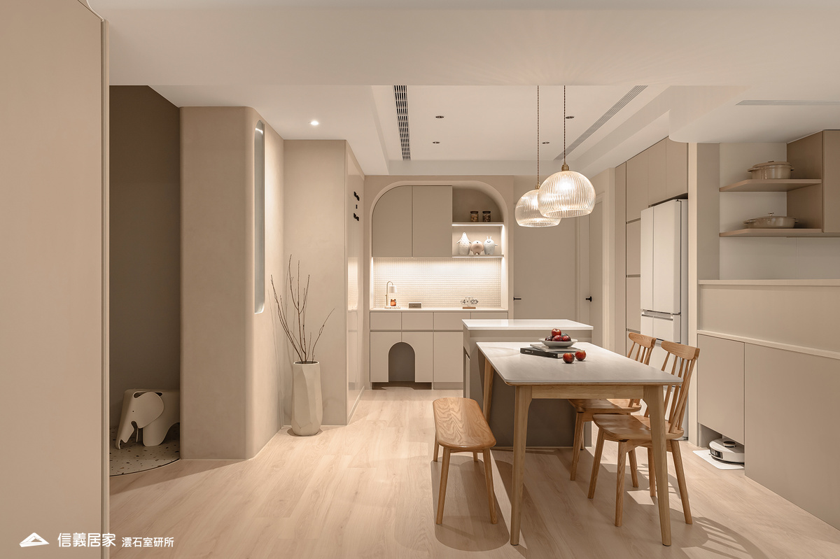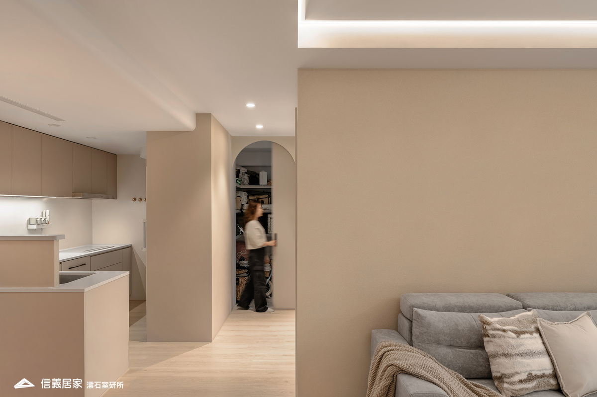 介於客廳與餐廚中間的圓形拱門造型設計,其實偷偷隱藏了設計師小巧思,運用前往工作陽台的廊道一區,將其規劃成步入式儲藏間,不僅視覺延續柔和語彙的同時,也大大增加了日常收納的餘裕,收與藏不必宣告存在,生活因此更顯自在有序。