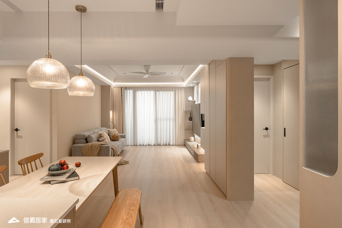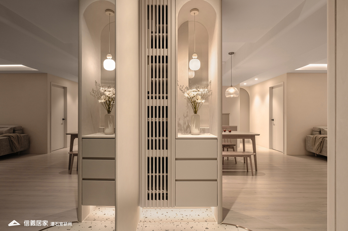 奶茶色鋪陳整體基調,揉合著柔光、圓弧與家的氣息。一進門,玄關以落塵區輕聲迎接,地坪選用水磨石拼花,搭配圓潤勾勒小冰柱玻璃隔屏做為端景,柔和中添點俏皮。一旁延伸的鞋櫃格柵門片讓視覺層次更為豐富,同時兼具透氣與美感,宛如呼吸般自然。