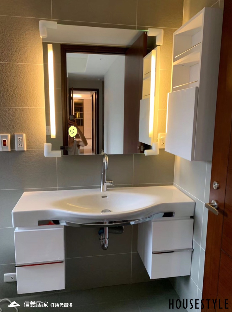 位於角落處的鏡子,缺乏了照明的光源,噴砂 + LED燈解決了光線的問題並讓角落變身成空間的亮點;感應式開關安裝在鏡面的左下角,因為考量到使用位置及高度還有揮手感應的位置,右邊的凸起處相對較不順手。