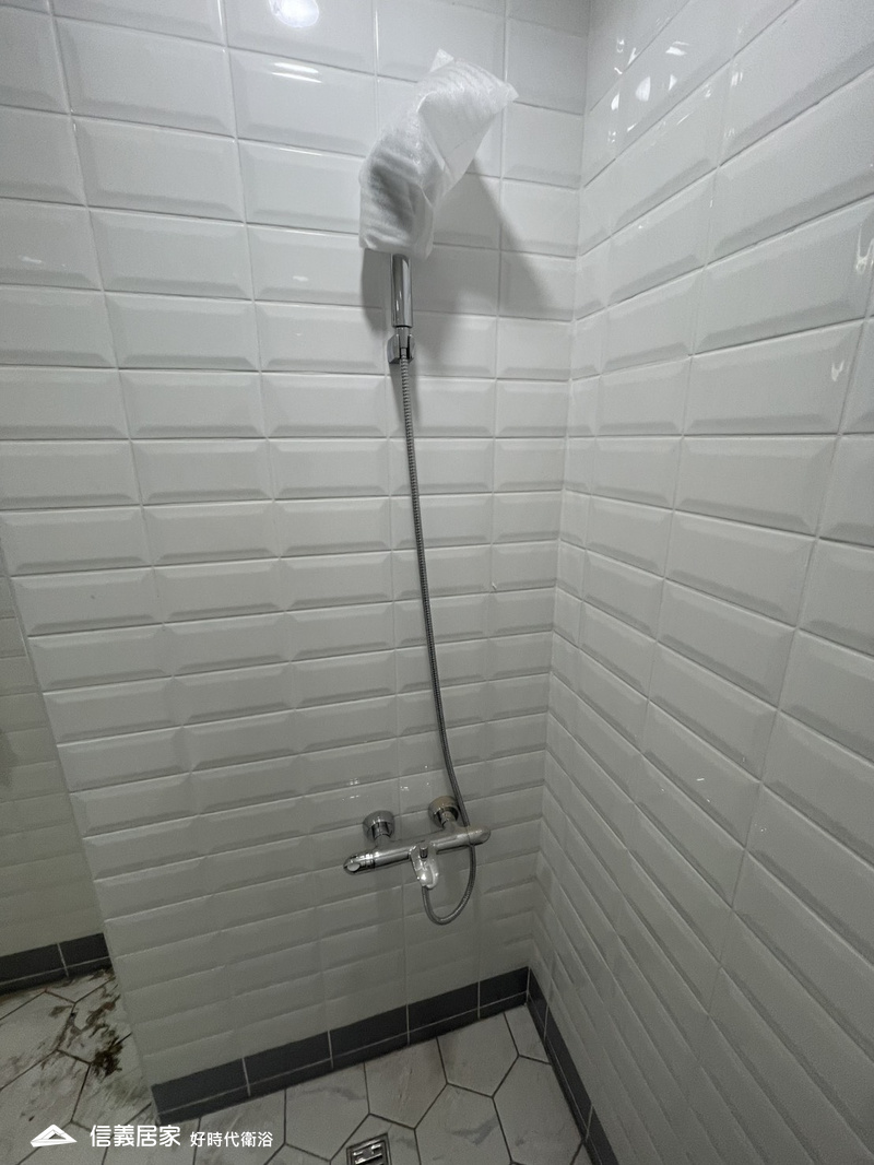改造後的浴室以純白鐵道磚鋪滿牆面,線條乾淨俐落,視覺瞬間被拉得更開、更亮。地面則選用六角地磚,幾何紋理讓空間多了層次,也增添一點現代感的俐落氣息。整體由白與灰調構成,光線在瓷磚表面反射後,使浴室呈現明亮、透淨又帶點精品旅宿的感覺。