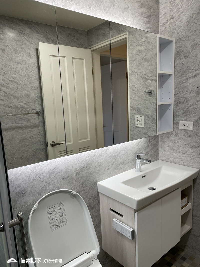 好時代幫汪小姐規劃設計的新浴室環境,配置了鏡櫃的收納空間,以及現代感十足的洗手檯浴櫃,具有高檔的外觀和細緻的品味,搭配高效的設計,使生活更舒適和方便。