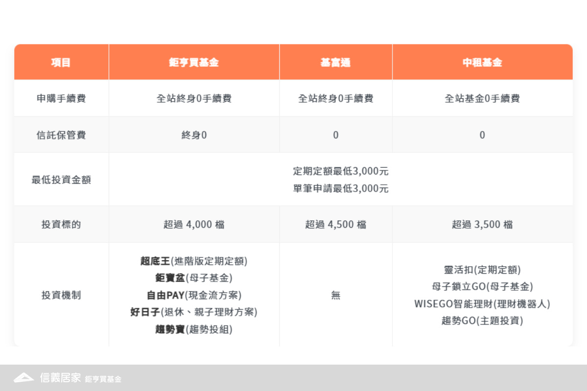 綜合來看,三大平台雖然都主打「0 手續費、0 信託保管費」,但鉅亨買基金在功能設計上更貼近投資人需求,例如進階版定期定額的「超底王」、母子基金配置的「鉅寶盆」,以及靈活運用現金流的「自由Pay」等特色服務,能讓投資策略更有彈性。