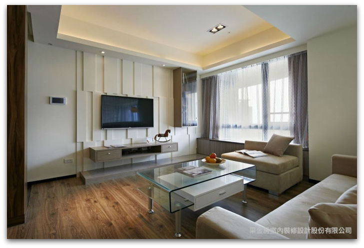 ▲純白幾何切割的電視牆面,搭配懸吊式置物櫃體讓空間不大的客廳感覺輕盈舒適。