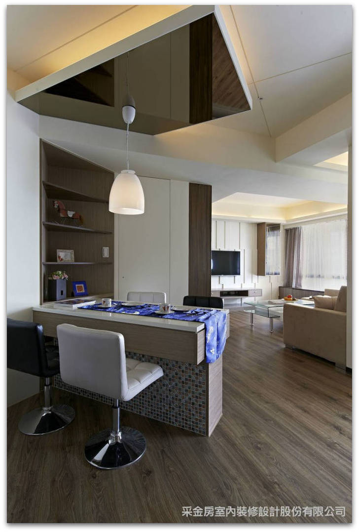 ▲用餐區上方的天花板,設計師利用幾合切割與鏡面處理,讓用餐區融合在整個空間規劃設計的中心點。面貼馬塞克磚的餐桌還有一項巧妙的活動延伸檯面設計,坐7~8人也不擁擠,屋主可以盡情的招待來訪的客人。