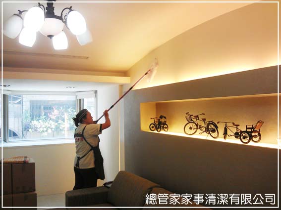 天花板、櫥櫃上端等不容易碰觸到的地方,容易積累灰塵與蜘蛛網,可運用市售可伸縮拖把,外面套一層防塵帽,逐一將粉塵與蜘蛛網吸附清除就可以了。