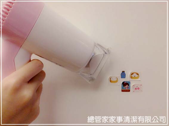除去牆上的膠帶、泡棉並不難,首先用吹風機吹牆上的貼紙,建議從角落開始吹,會更容易拔起。貼紙遇熱軟化後,殘膠就很容易撕除了,如果撕除後還有些許殘膠,只要使用除膠劑或松香水塗抹在殘膠上,就能不留痕跡的撕下來囉!