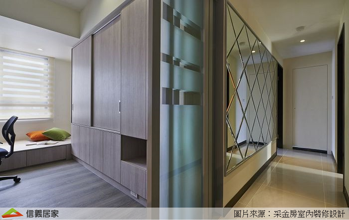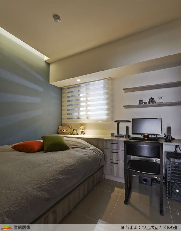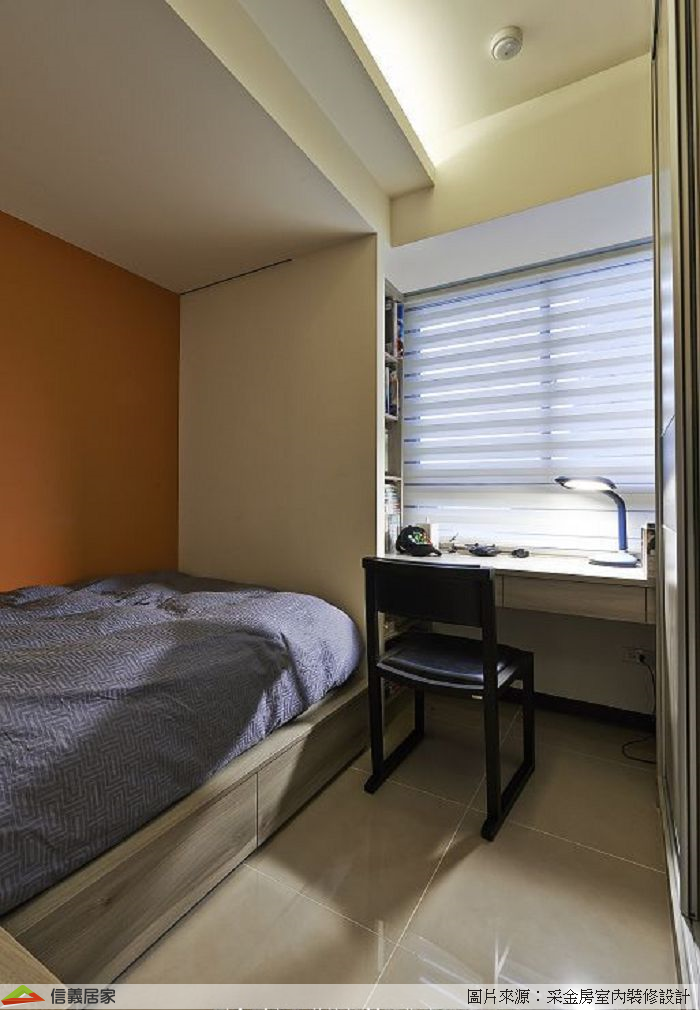 利用牆面的跳色與窗簾燈具等產生的光影變化,就使得空間活潑起來,系統傢具不再是呆板的櫃體。盡量減少木作或現成傢具的做法,不光是能解除對蟲害的擔憂,在長期居住的環境中尤其是小孩房臥室,使用低甲醛的系統板材,對孩子健康也有益處。