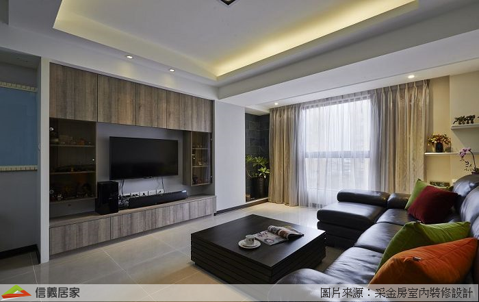 電視櫃分為上下、左右與中間三部分,各別運用系統板、茶玻及灰藍色油漆等材質,增添變化性;櫃體不作滿,窗旁的端景空間帶來的綠意,增加愜意休閒感。