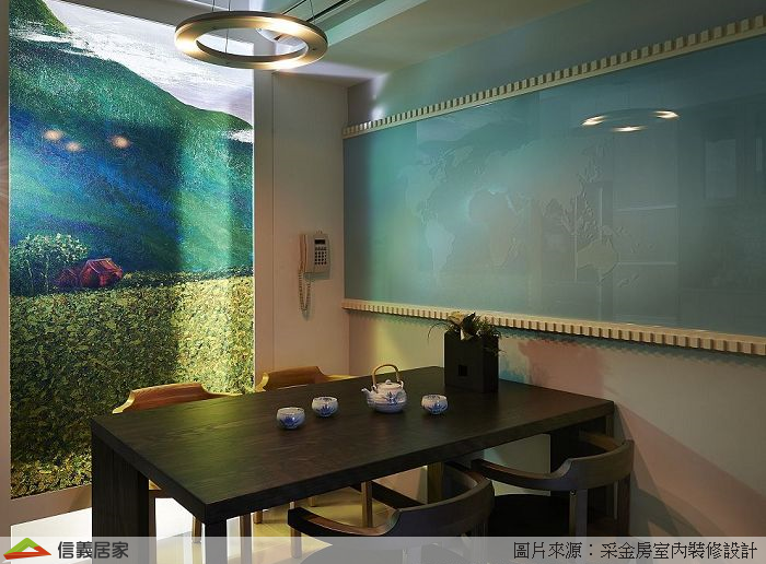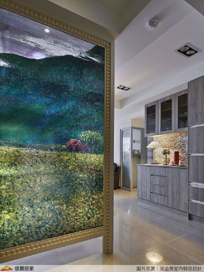 沒有陽台的室內空間,運用玄關的彩繪屏風將大草原帶進來,滿足屋主喜愛環遊世界不受拘束的自由。 電器櫃與餐櫃並排,將用餐所需的家電和餐具整合於同一區域,讓備餐更便利順手,不用往返於餐廳與廚房。