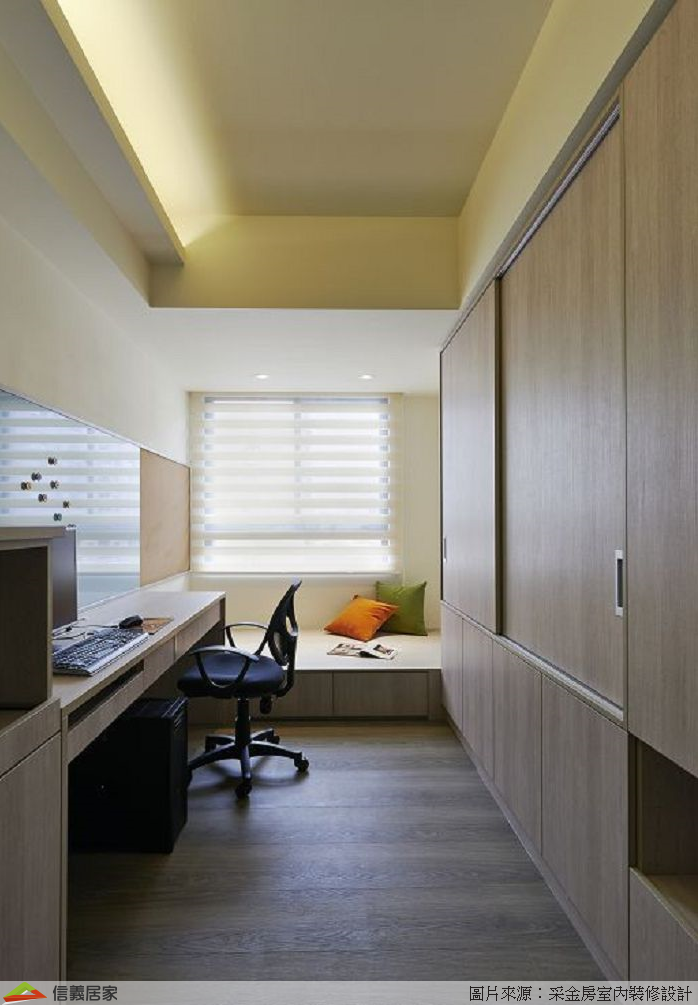 書桌旁規劃擺放機器櫃,後方則是一整面書櫃,以滿足一家四口的藏書量,並以門片遮蔽雜亂,又不會累積灰塵。臥榻除了下方的大收納空間,在有親朋好友來訪時,即可轉變客房。整間房間難以櫃體為主,但利用具透明穿透性的玻璃拉門讓空間不會感覺沉重。