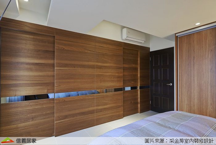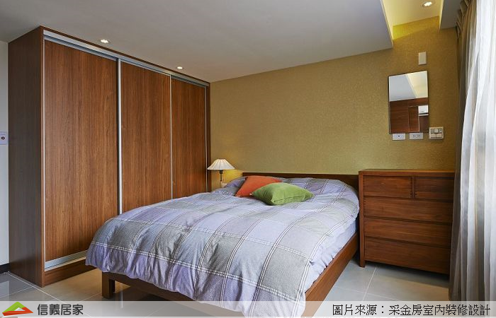 衣櫃依屋主喜好以深色柚木為主,並搭配現成五斗櫃呈現整體感,更衣間木作拉門也選擇相似木皮,相互呼應。床頭牆面以硅藻土處理,打照健康環保的環境是處處為客戶著想的設計理念。