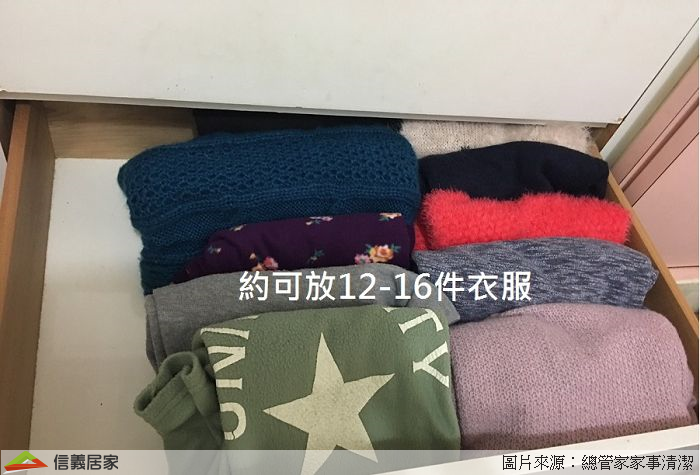 針織衫等衣物質地又厚又粗,在台灣不一定會常常穿到。建議您,擺放的時候可以放入下層得抽屜或用透明收納箱收納節省空間,加上毛衣等不適合擠壓,疊放的時候以兩層為限!也方便抽取。