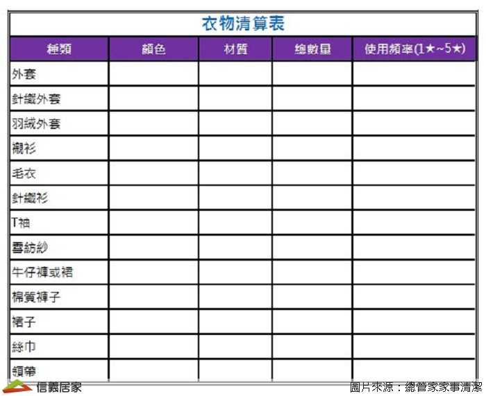 除了鞋子可以有清算表,衣服也可以作一張清算表,多多利用「衣物清算表」檢視自己跟家人所有的衣物,也可以當作當季添購新衣服的參考;才不會買了又買都是些不實穿的衣物 ,結果這些衣物的下場就是捨不得丟,繼續堆放。
