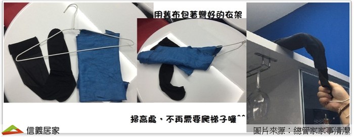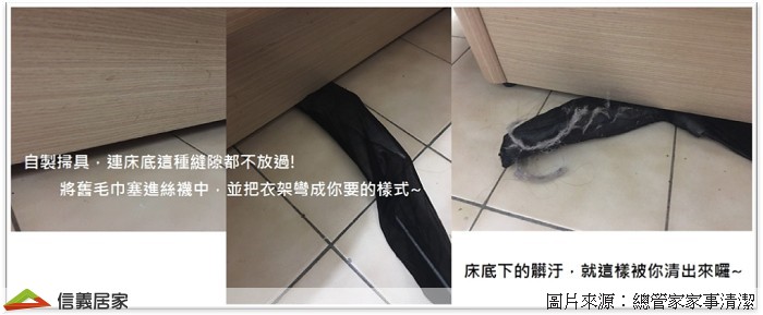 把家中一定有的舊衣架、舊絲襪、還有舊毛巾組合一下,自製掃具就出現囉;除了可以掃高處之外,就連床底的縫隙、櫥櫃的底下等容易藏汙納垢的地方都不放過!
