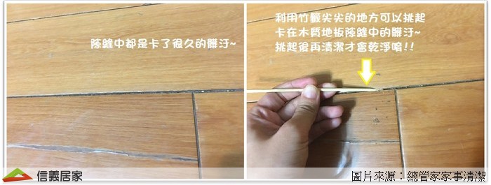 這時候先利用竹籤尖尖的頭,把這些個髒東西挑起來、再進行清潔,才不容易弄傷木質地板喔!