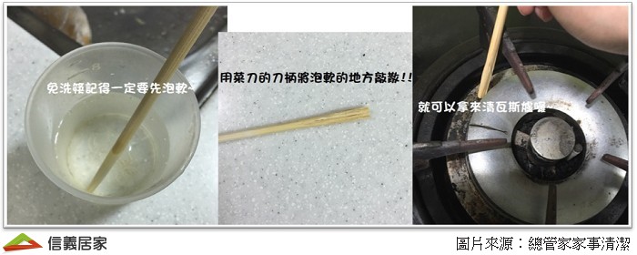 瓦斯爐架周邊都有很小的細縫,這時請把免洗筷拿出來,用菜刀的刀柄將免洗筷敲散,用來清這些小隙縫超級方便。
