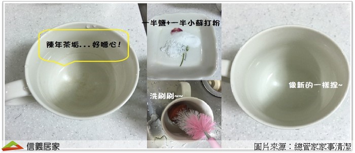 將小蘇打粉和鹽以1:1的比例混合,用濕牙刷或海綿沾取混合物、直接刷洗杯子內的茶垢即,再也不怕杯子不能恢復光亮潔白囉!