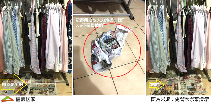 陰雨天,洗好的衣物不得已要曬在室內的話,可以在底下鋪上報紙;報紙會吸收水氣,衣物或棉被都會比較快乾。另外,將報紙捏皺後再攤平,效果會更好喔!