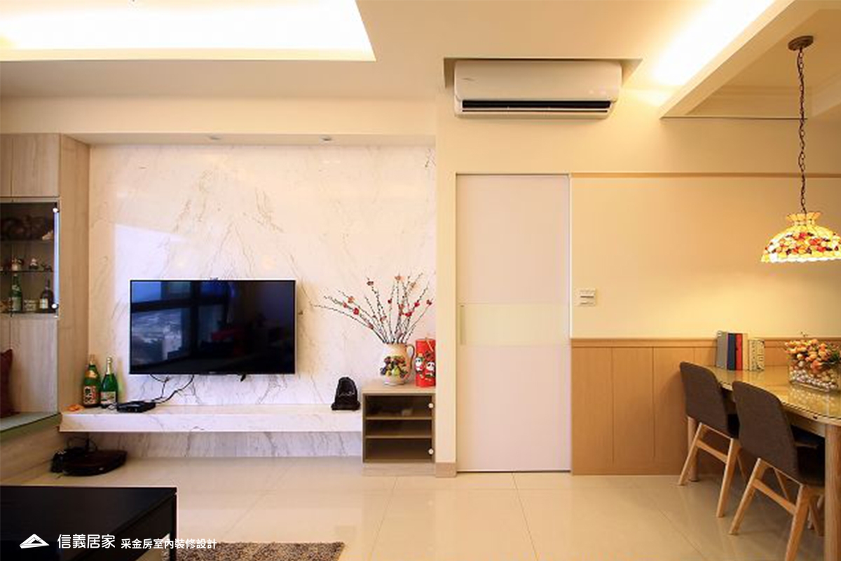 客廳放置簡單線條的皮質沙發,搭配雪白大理石紋的電視牆,連接坐擁落地窗景的臥榻,讓視覺極具開放感;實木餐桌椅搭配暖色燈罩,為餐廳帶來溫潤的質感,也能替使用大量石材的客廳帶入溫暖的氛圍。