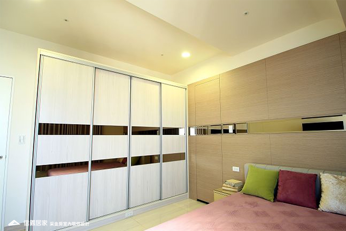 主臥室運用簡潔線條分割,並且用鏡面腰帶在牆面與櫃體做點綴,不僅減少呆板的感覺,還添加了幾分設計感。