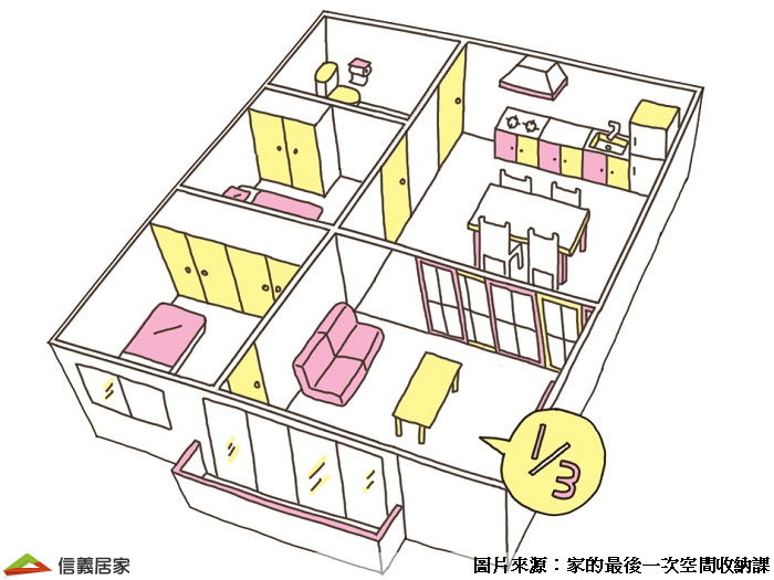 客廳屬於全家人共用的公共空間,在佔比上來說會是比較大的,約為整體空間的1/3,也可以和餐廚區結合,擴大至1/2。