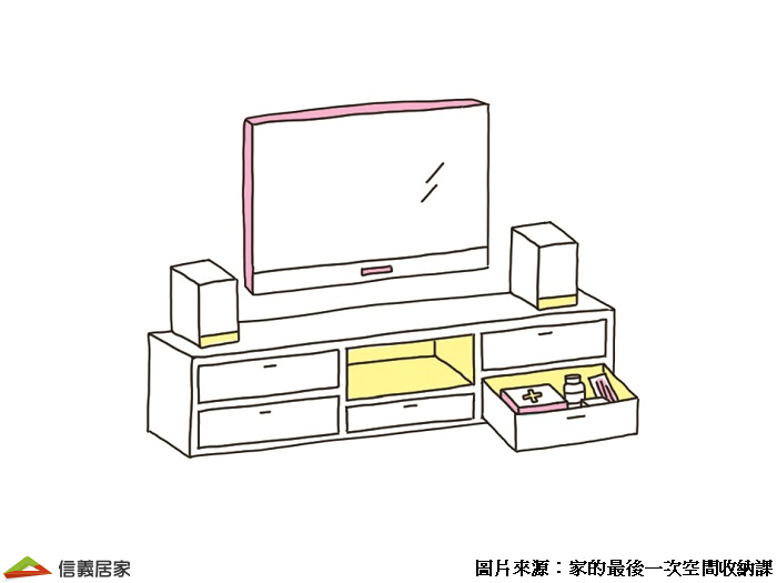 客廳的電視櫃除了擺放電視、視聽設備之外,一些居家常備用品,例如:藥箱、工具箱、電器說明書、替換零件等,也會一併收納在這裡,因此可以設計幾個深度20公分內、適合放置小物件的淺抽屜,不要太深才方便拿取使用。