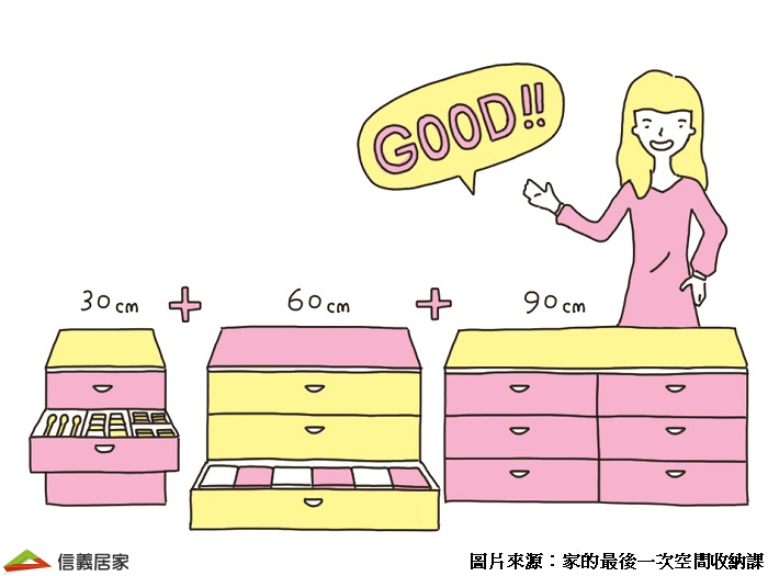 廚房裡的物件品項、種類很多,在收納上需要利用配件輔助,像是餐具分隔板、保鮮盒等,因此廚具最好避免使用特殊尺寸,以30公分、60公分、90公分的規格化尺寸搭配組合,一來可因應空間彈性組裝,二來日後若要更換內部器具,也容易找到配件套用。