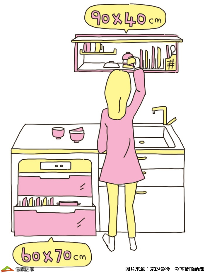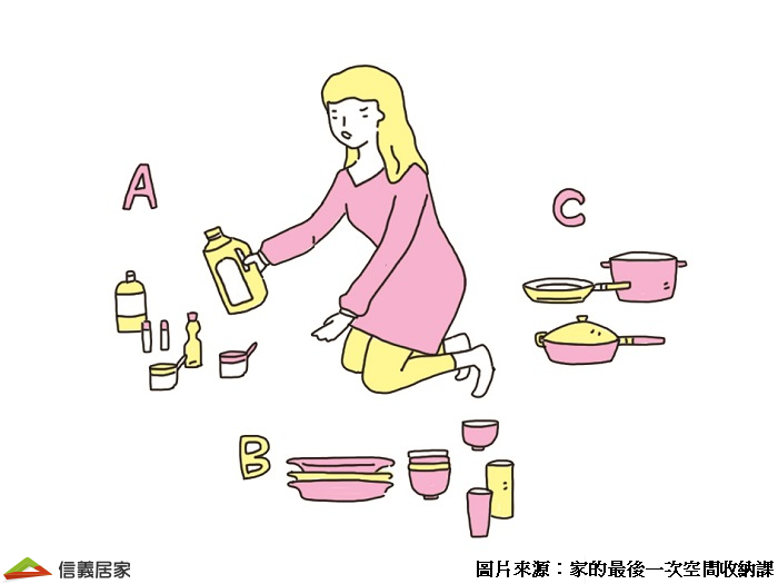 尺寸、大小及高低不一的廚房用品,如果沒有確實將物品做好分類,經常會發生要用時翻箱倒櫃找不到的窘境,因此一定要把物品依照尺寸分類,再規畫擺放的位置,如:餐具、碗盤、鍋具等以深淺抽收納,調味料等較高的物品,則擺放在廚櫃下層,清楚明瞭又順手好拿。
