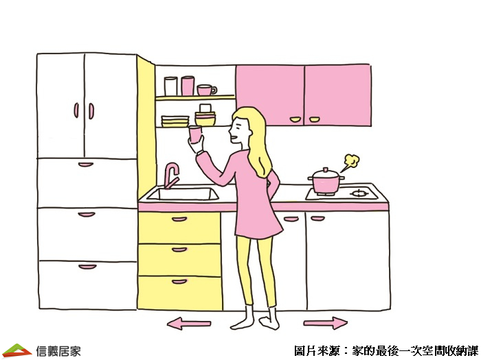 廚房的使用動線很重要,若動線設計不流暢,會直接影響到收納效率。廚房動線的最佳安排為:冰箱→水槽→爐子,從冰箱拿出食材至水槽清洗,不需使用的順手就可放回冰箱,待處理好之後再於爐子上烹調,料理完後的鍋子即可放到旁邊水槽清洗,不會「卡卡」的順暢動線,讓人能隨手完成收納。