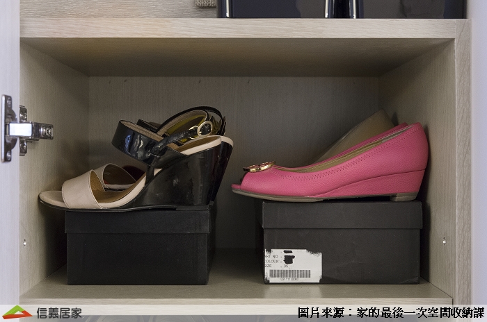 有人認為鞋盒佔空間,但其實也有助收納,可將不常穿的鞋收在鞋盒,鞋盒上就擺放常穿的放在盒上,好拿又達到雙層收納功能。若是高櫃,換季才會拿出來的鞋子,則可以往櫃子最上方擺放。