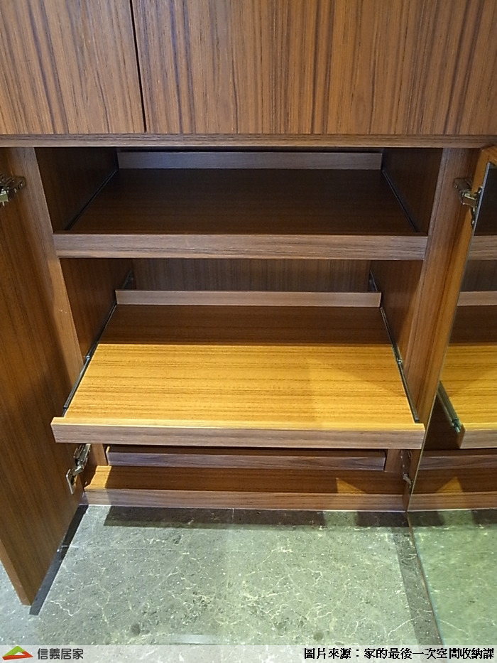 因為鞋子會因人和鞋型,有大小、高低的不同,所以櫃內層板必須採活動式,才能因應鞋子種類調整。此外,若是上櫃想做為衣帽櫃,深度約60cm,下櫃也可採取滑軌式層板,前後都可以放鞋,增加收納量,也方便拿取。