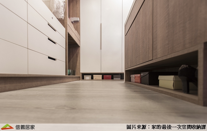 家中更衣室的衣櫃下方,在選購訂製時,不妨可以預留最下方的空間,收藏平日較少穿的鞋子,透過擺放與排列,即使鞋盒外露也有齊整感,同時也好尋找想穿的鞋子。