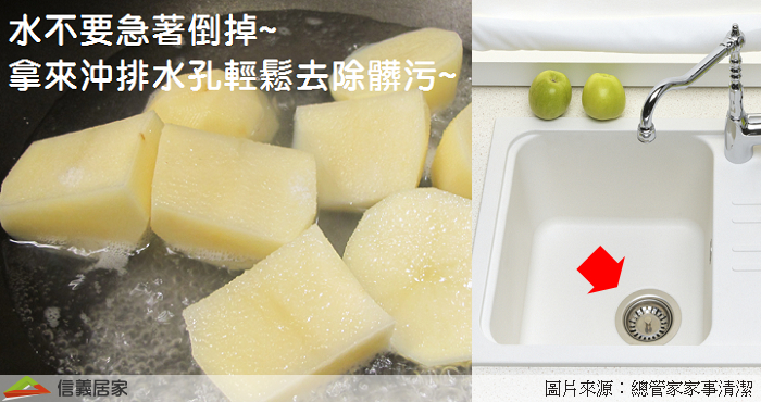 之前我們分享了用小蘇打粉來疏通和除臭的方法,但如果你沒有小蘇打、剛好又煮了一鍋馬鈴薯,這個時候你也可以將煮過馬鈴薯的熱水、直接倒入排水孔,你會發現這不僅可以解除阻塞,還可以消除排水口的異味!下次煮咖哩飯時,可別忘了試試看這招。