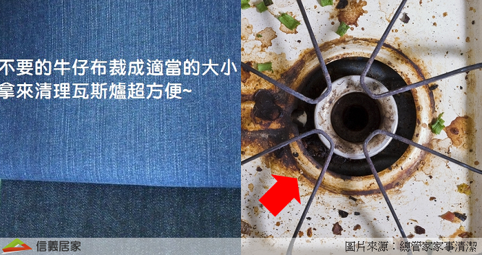 經過日積月累,爐面上的油垢可能很難用抹布就擦乾淨,這時候可以將不要的牛仔褲剪成小塊,再用牛仔布塊來清潔瓦斯爐。因為牛仔褲的布料纖維比較粗、也有一定的硬度,只要沾一點點的清潔劑,就能輕鬆跟油污說掰掰。