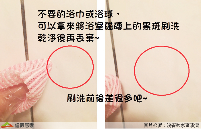 尼龍製的沐浴巾或沐浴球,汰舊換新可別急著丟掉,還可以廢物利用,戴上手套用它們刷洗磁磚上的霉垢,這些黑斑很快就被「嚕」掉囉。但你可別以為刷洗乾淨就好,還要記得殺菌;將消毒用酒精裝入噴霧瓶,均勻噴灑在整間浴室牆面,就可以有效防霉(噴灑時要注意空氣流通)。